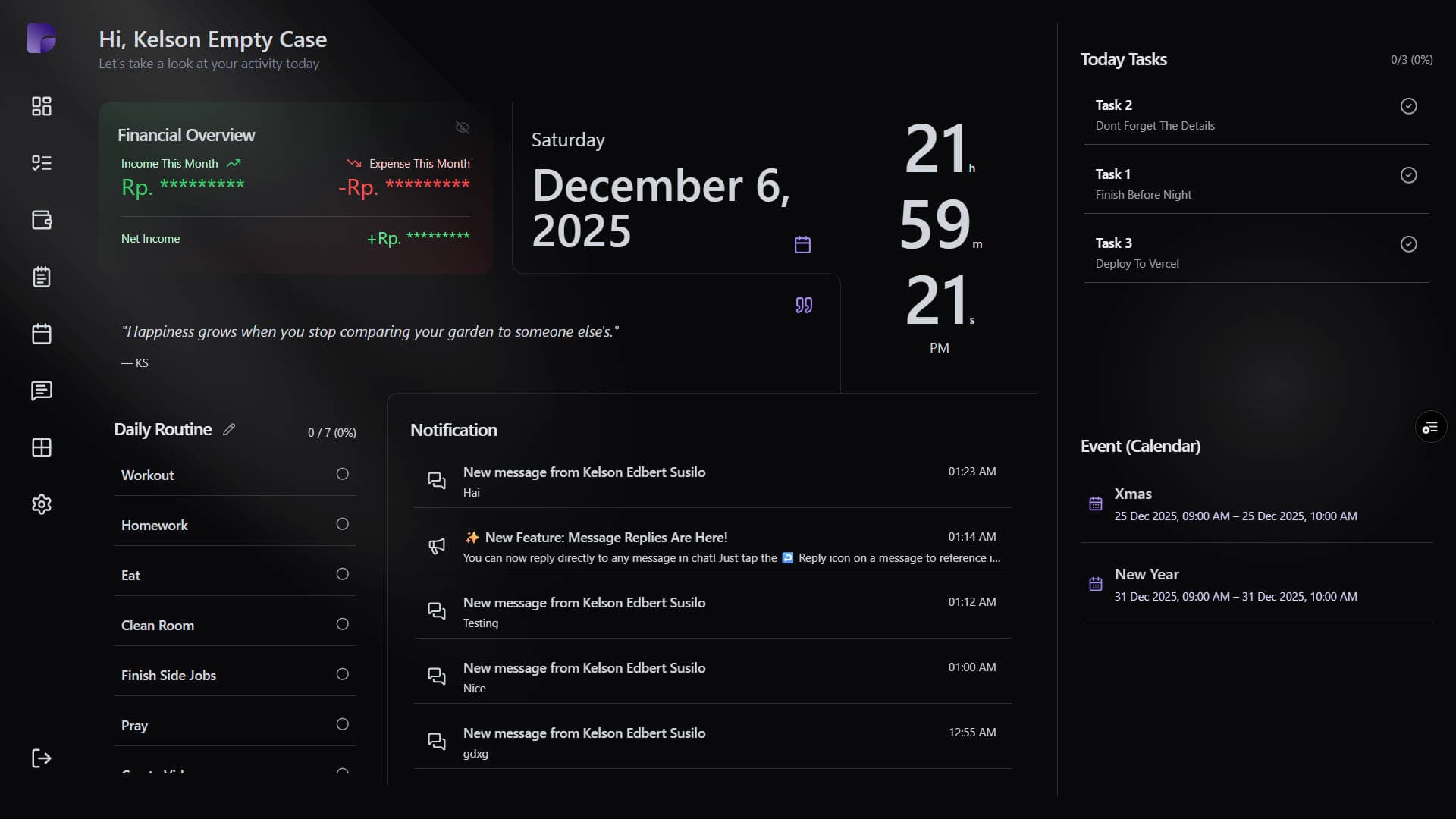 Stay organized, focused, and in control with a simple all-in-one space for your tasks, finances, and daily planning.